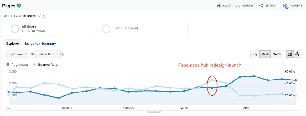 Over the 2-3 months following the launch of the redesign, Campaign Monitor saw a 2X raise in site visits as well as a 50% drop in bounce rate on the resource hub pages. It's not always the case that you have such a clear validation of a redesign in site analytics, so we were excited to see the clear impact this project had.