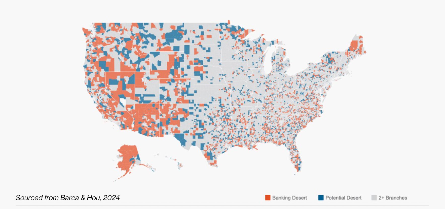 Waves of branch closures in recent years have been disproportionately represented by large financial institutions - those with 10 billion dollars or more in holdings (Cerulli, 2025). These larger institutions have seen more than a ten percent decline in open branches from 2019 to 2023. The closing of many branches has created banking desert zones, which are defined as surveyed tracts that have zero banks within a defined radius from the center. The length of the radius is dependent on the population density. In urban zones banks are expected to be more densely packed, thus the definition of a desert is less forgiving and uses a shorter cutoff radius than in rural areas. Access to fewer bank locations has pushed many users to conduct their banking online, but in a 2024 report as many as 39% of those in desert zones also had limited broadband access (Barca & Hou, 2024).