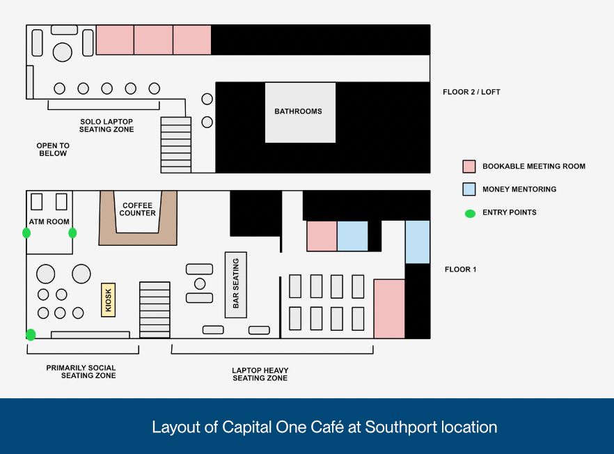 Physical consumer needs, many of which relate to Bosson’s urban design factors, provide a baseline for a “practical” business that meets community needs. Capital One Cafés build on this with amenities like high-speed internet access and access to ATMs.