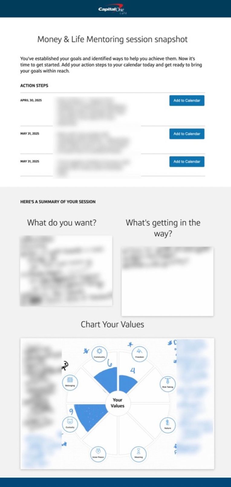 The worksheet with the values and goals, as captured by the mentor, is shared at the end of the session with the participant. Calendar invites for the due dates of each identified goal are included as well. When scheduling subsequent mentoring sessions, the availability calendar automatically filters by your mentor’s availability. You can opt to change mentors, but Capital One nudges users towards longer-term relationships with their Money and Life mentors.