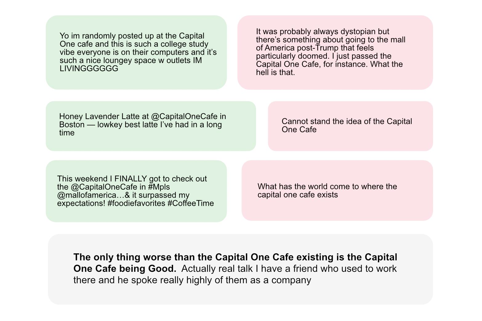 Visiting the Capital One Café made it clear that the space successfully fulfilled needs for both socialization and work, and I was curious how this may have been reflected online. I collected ~475 tweets from X mentioning the Capital One Café over the last two years to conduct an analysis of the discourse and sentiment surrounding Capital One Cafés in the online space.