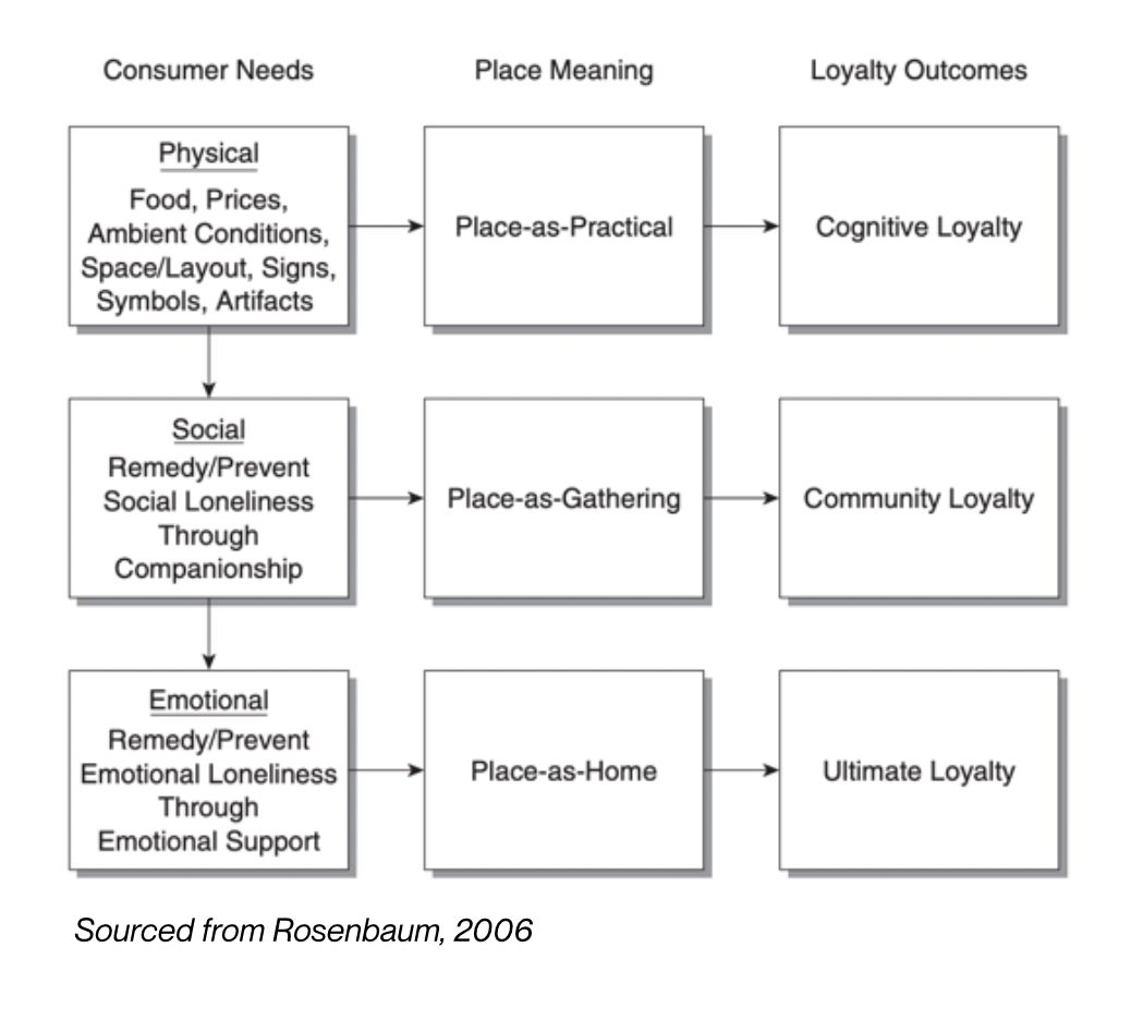 To advance the meaning of a place to “Place-as-Home” through emotional connection is the pinnacle of relational third place theory, and consequently ultimate customer loyalty. This step requires adequate provisions for the previously mentioned social and practical needs, multiplied over time to allow the evolution of strong personal bonds. (Rosenbaum 2006).