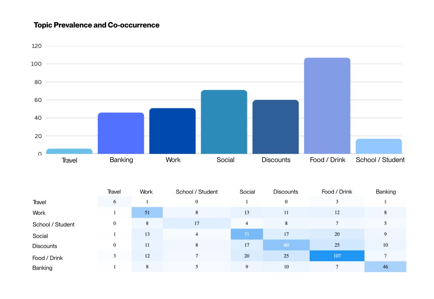Next, I ran a topic analysis on the data pulled from X with buckets for the following themes: travel, work, school/student, social, discounts, food/drink, and banking.